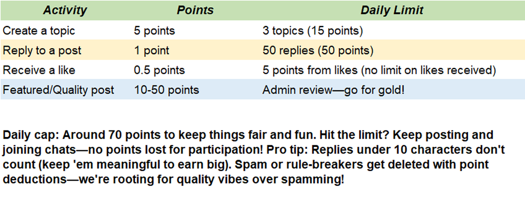 Points are your ticket to glory, tracking your epic contributions like starting topics, dropping replies, and snagging likes. Forget boring check-ins—we're all about real, energizing interactions! These points level up your reputation and shine bright in your profile (check your total anytime). Admins can tweak them for ultimate fairness—keep it positive! -